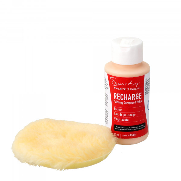 This Scratch Away SAW195 Polishing pad yellow is our finest wool polishing pad and is to be used when renovating powder coating, plastic surfaces, epoxy, gel coat, polyurethane-based two-component paint, etc. All these materials are without clear coat and therefore extremely delicate to ultimately provide the entire surface with a uniform high gloss. The Scratch Away SAW195 Polishing pad yellow should be paired with the Scratch Away Recharge Step 2 compound.
